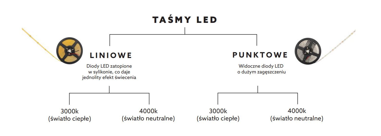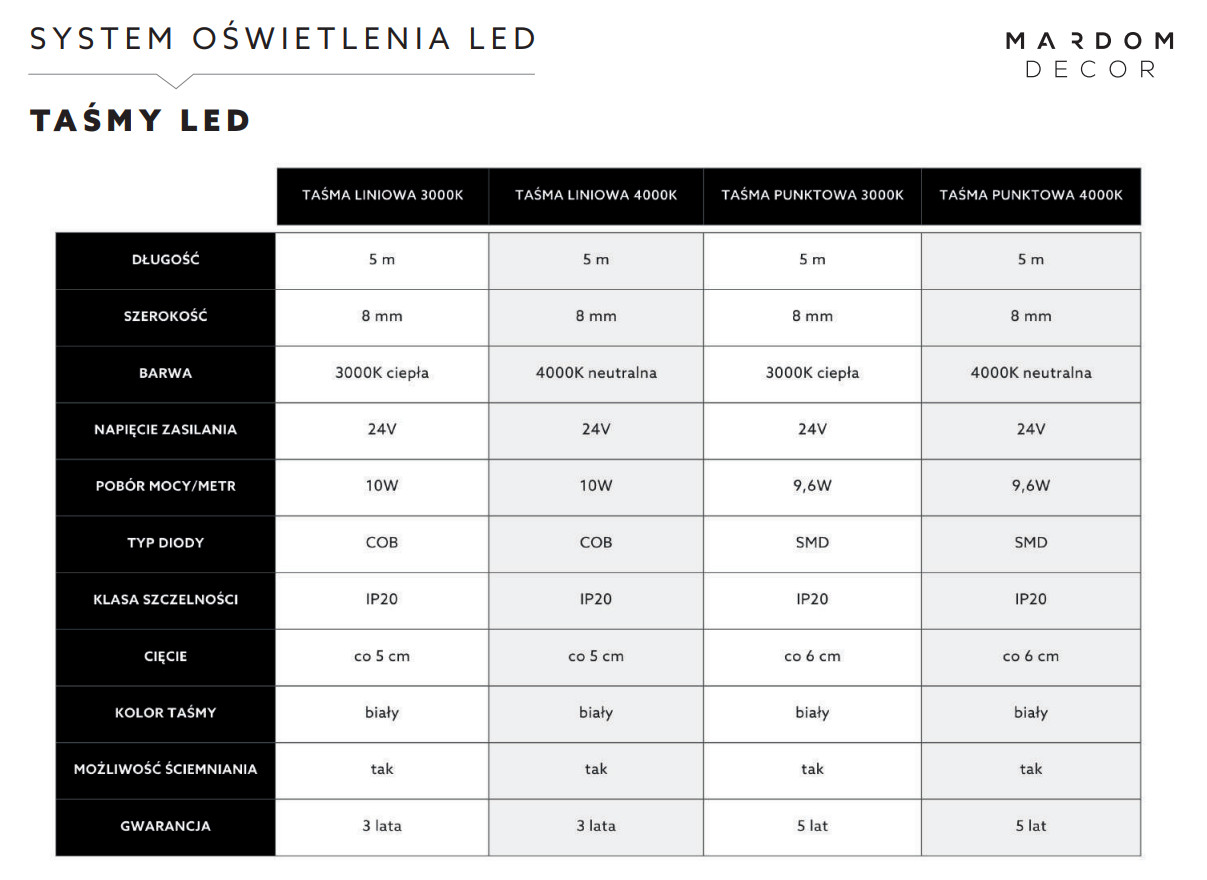 Taśmy LED Mardom Decor to najwyższej jakości element oświetleniowy, który doskonale sprawdzi się do podświetlania listew oświetleniowych oraz karniszowych. W ofercie posiadamy 2 typy taśm LED, dostępne w 2 odcieniach światła: