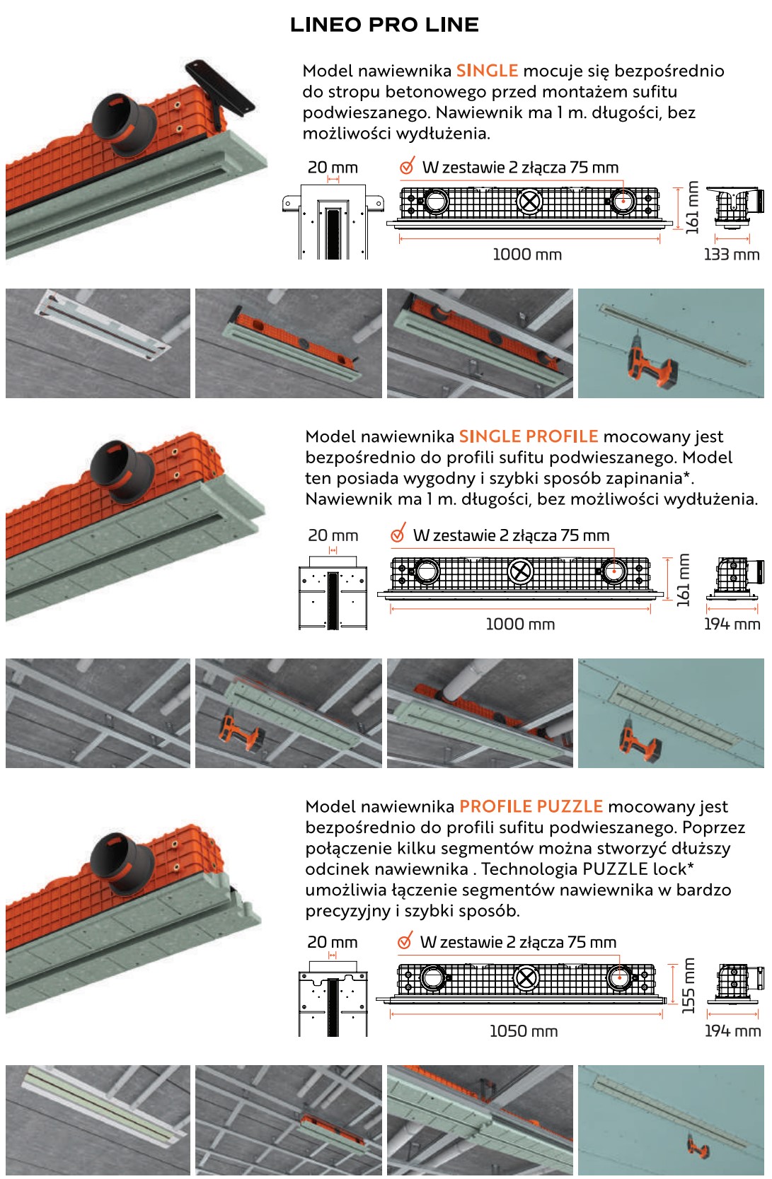Możesz wybrać standardowy nawiewnik o długości 1m, lub łatwo i szybko połączyć klika takich nawiewników tworząc ciąg o dowolnej długości. Umożliwia to model nawiewnika posiadający specjalny system połączeń PROFILE PUZZLE, dzięki któremu zrobisz to bardzo szybko i precyzyjnie. Taki montaż może z łatwością wykonać jedna osoba, gdyż poszczególne segmenty nawiewnika łączą sie w jedną całość i mocowane są bezpośrednio do profili sufitów podwieszanych.
