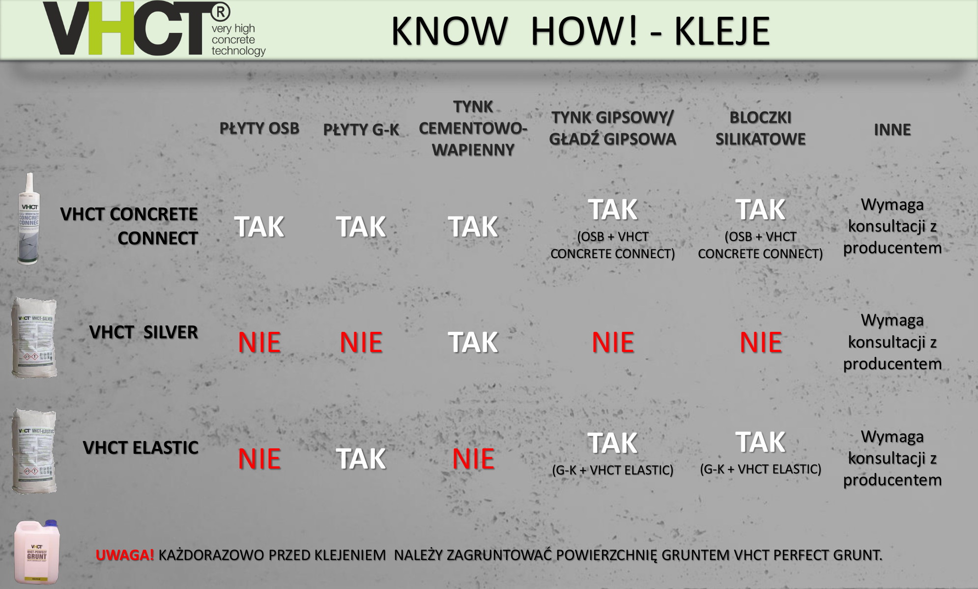 - Polecamy klej polimerowy VHCT CONCRETE CONNECT pozwalający na szybki, łatwy, i trwały montaż płyt betonowych do każdego rodzaju powierzchni (za wyjątkiem tynku gipsowego) zarówno wewnątrz jak i na zewnątrz,